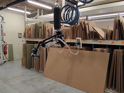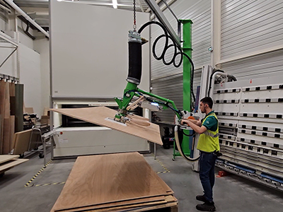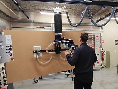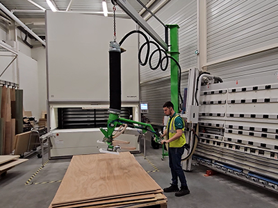 Avec le basculeur de panneaux 80 kg, la poignée de commande MASTER Plus est équipée d’une option de basculement qui permet à un seul opérateur de saisir, lever, basculer et déposer des panneaux volumineux jusqu’à 80 kg. Un vérin pneumatique, commandé très simplement, gère l’inclinaison de la charge. Cette solution est idéale pour alimenter des scies ou d’autres appareils de production avec des panneaux lourds et encombrants.